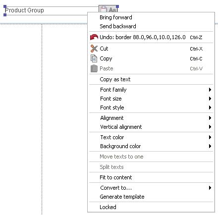 The next step is to place another text frame in the header. It will be combining dynamic and static text which means it will show the static label "Product Group" as well as the dynamic name of the changing product groups (as they will change according to the product group which is presented in the page). We will also fill the table with text frames, both dynamic and static.