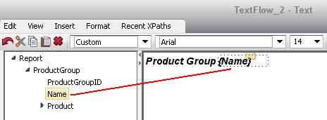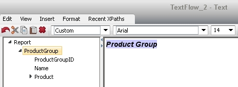 Now you need the XML tree on the left side, we mentioned it earlier. The text you entered so far is static text, this means it is not depending on any XML content, therefore it will not change. But we want to display the name of the product group there as well, which will be dynamic text, changing according to the XML content. To achieve this, drag the node Report/ProductGroup/Name to the right of the static text (don't forget the blank space between them):