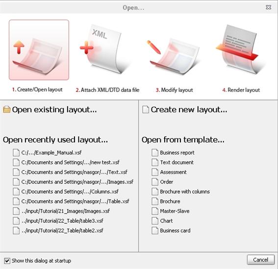 This is XSLfast when you start it. The wizard indicates what you want to do - open an existing layout or create a new one.